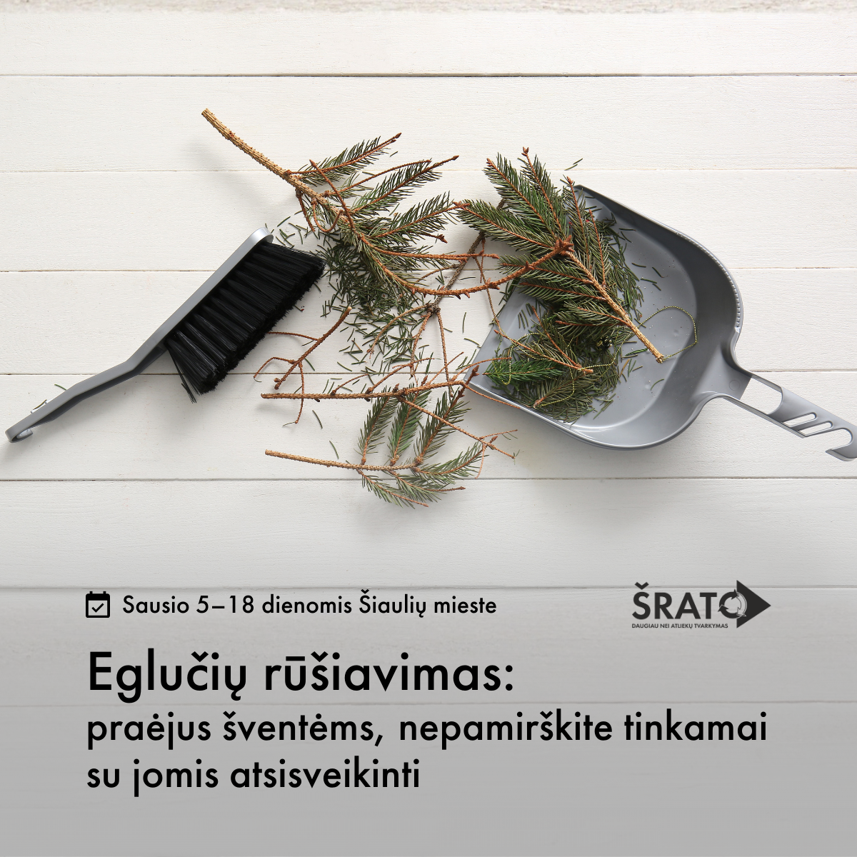 Nurimus šventiniam šurmuliui, gyventojai, kurių namus puošė gyva eglutė, kėnis ar dekoratyvinės šakos, raginami jas tinkamai išrūšiuoti ir nepalikti prie atliekų konteinerių. VšĮ Šiaulių regiono atliekų tvarkymo centro specialistai primena, kur ir kada galima pristatyti eglutes.