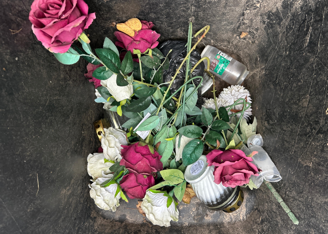 Jeigu iš žvakidės neįmanoma pašalinti vaško likučių, ji turi keliauti į mišriųjų komunalinių atliekų konteinerį. Suteptas ir nebetinkamas toliau naudoti plastikines gėles ir dekoracijas reikia išmesti į mišriųjų komunalinių atliekų konteinerį. Plastiko ir metalo pakuočių atliekų surinkimo konteineris yra skirtas tik pakuotėms ir jų dalims, dėl to plastikiniai gaminiai į jį negali būti rūšiuojami.
