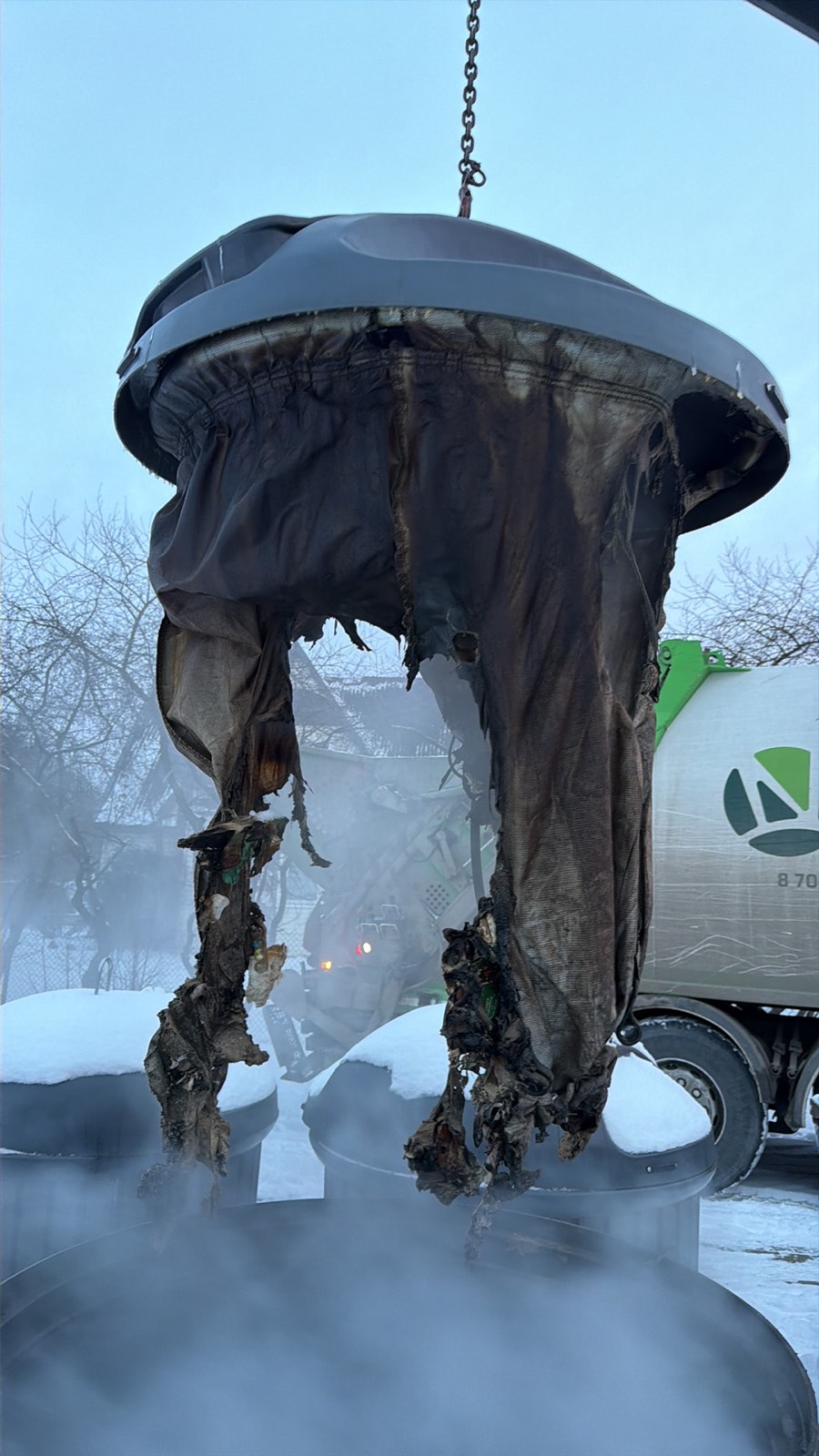 ŠRATC specialistai fiksuoja tokius atvejus ir dalijasi vieno iš apgadintų konteinerių vaizdu – matyti, kaip nuo karštų pelenų sudegė konteinerio maišas. Priklausomai nuo konteinerio talpos ir maišo medžiagos, patirta žala gali siekti nuo 300 iki 700 eurų.