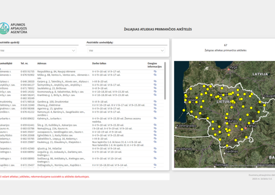 Aplinkos apsaugos agentūros (AAA) Aplinkos būklės analitikos centro specialistai parengė interaktyvų žemėlapį, kuriame pateikiama informacija apie žaliųjų atliekų surinkimo taškus. Šis įrankis padės gyventojams greitai ir patogiai rasti artimiausią aikštelę, kur galima pristatyti tokias bioskaidžios atliekas kaip želdynų karpymo atliekos, nukritę lapai, nupjauta žolė, gėlės, piktžolės, vaisių, daržovių atliekos, medžio žievė, pjuvenos, drožlės, skiedros, smulkios medžių, krūmų genėjimo šakos.