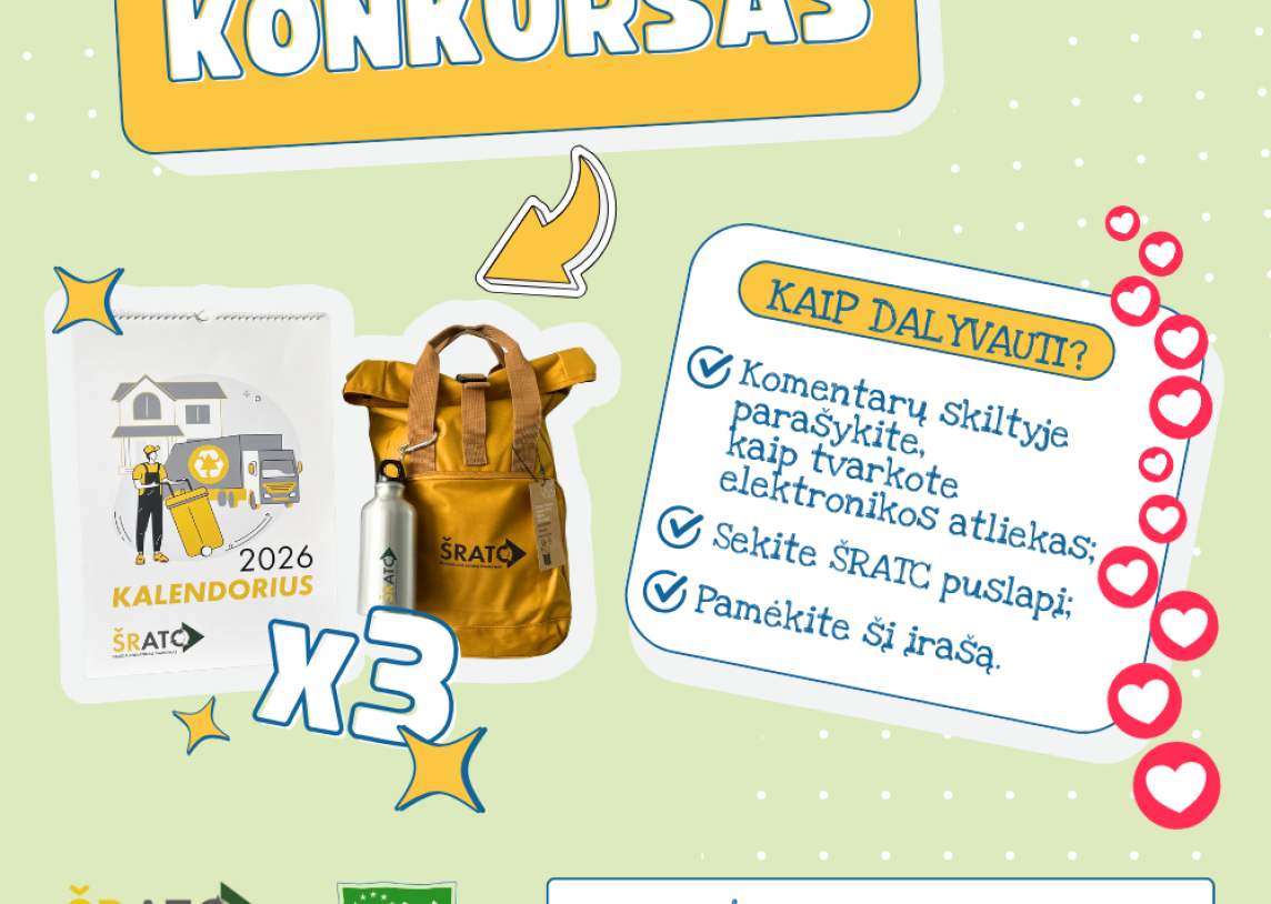 Atliekų mažinimo savaitės proga ŠRATC kviečia gyventojus dalyvauti konkurse savo „Facebook“ puslapyje (www.facebook.com/sratc) ir pasidalinti patirtimi, kaip jie tvarko elektronikos atliekas. Iki gruodžio 1 d. pateikusių atsakymus dalyvių laukia galimybė laimėti tris ŠRATC prizų komplektus – kuprines, gertuves ir kalendorius.