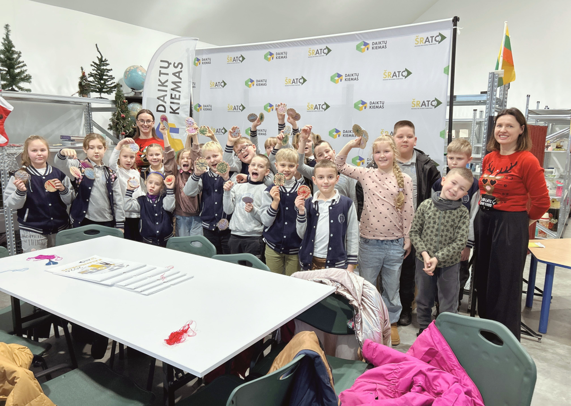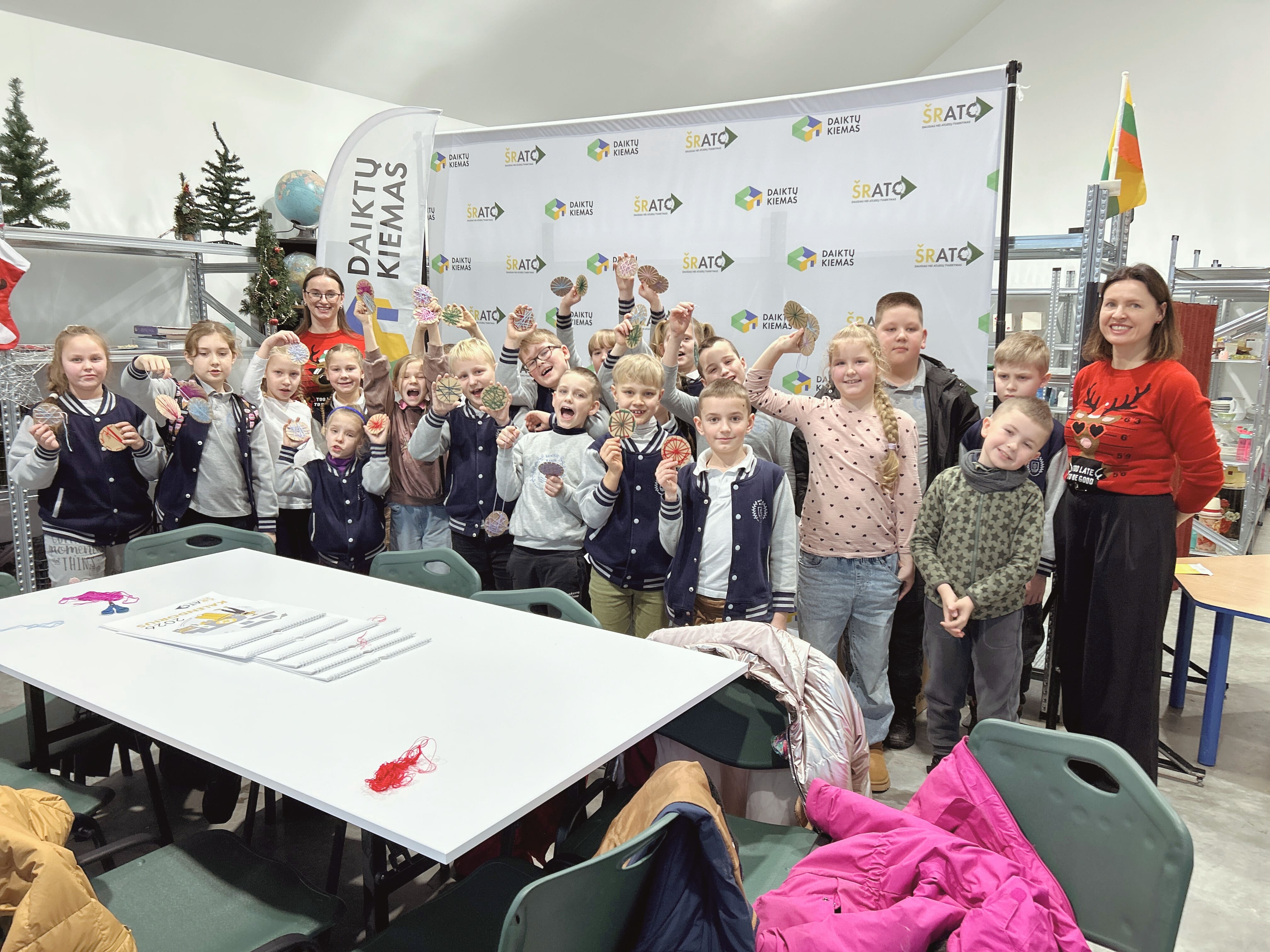 Po edukacijos vaikai dalyvavo kūrybinėse dirbtuvėse, kurių metu iš kartono ir siūlų likučių gamino žaisliukus savo eglutei papuošti. Veikla mažuosius taip įtraukė, kad kiekvienas pasidarė po kelias dekoracijas.